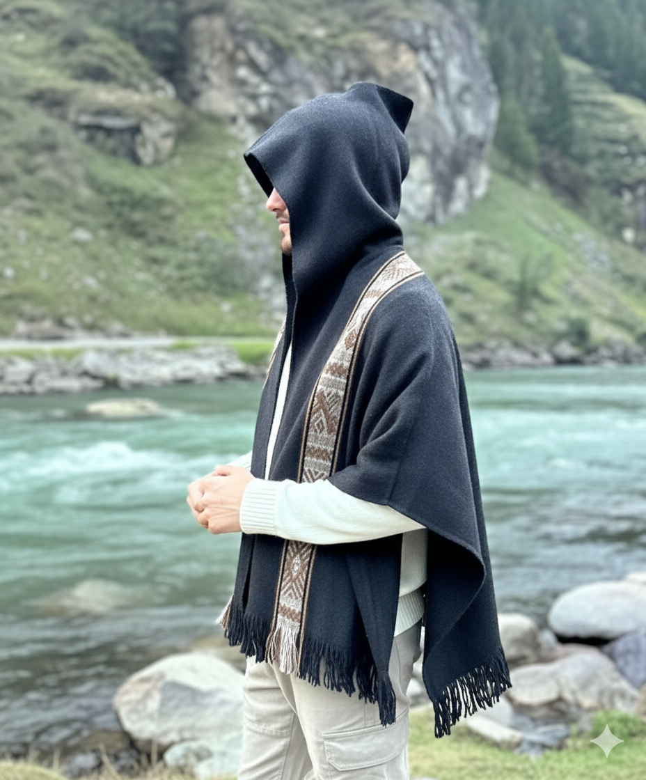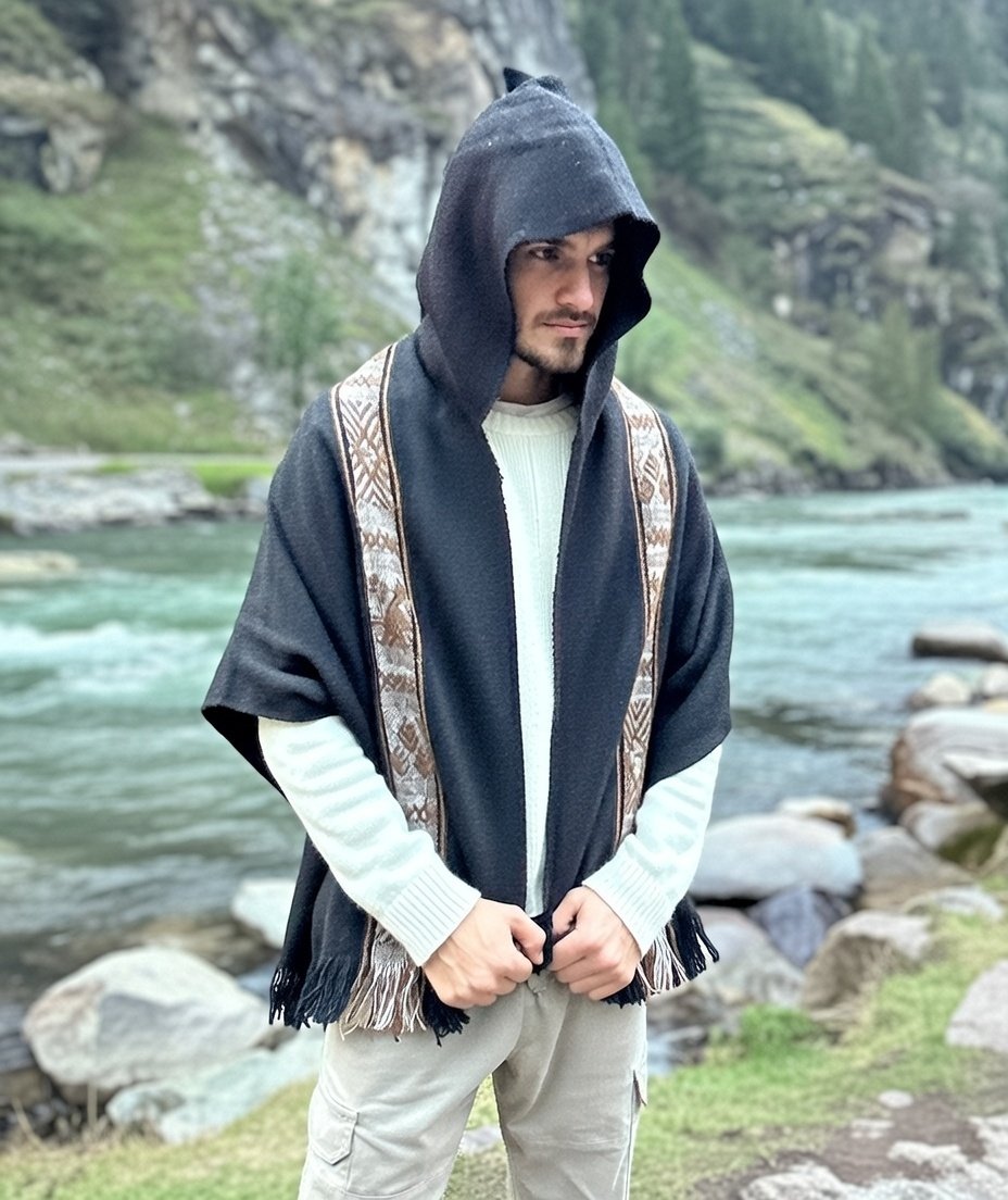 Experience the warmth and artistry of the Andes with this luxurious hooded wool poncho. Expertly hand-crafted, it showcases vibrant, intricate woven patterns along the borders, complemented by soft fringe detailing for a touch of elegance.